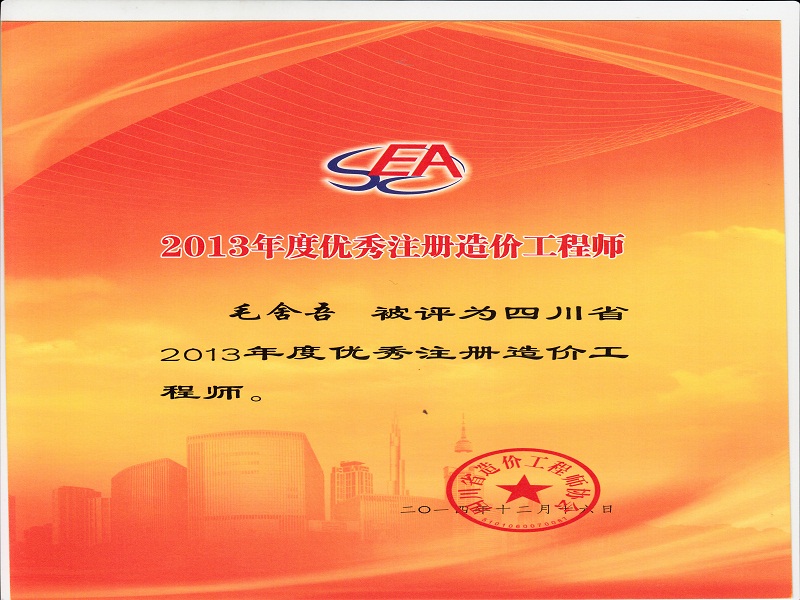 毛舍吾 2013年度优秀造价工程师