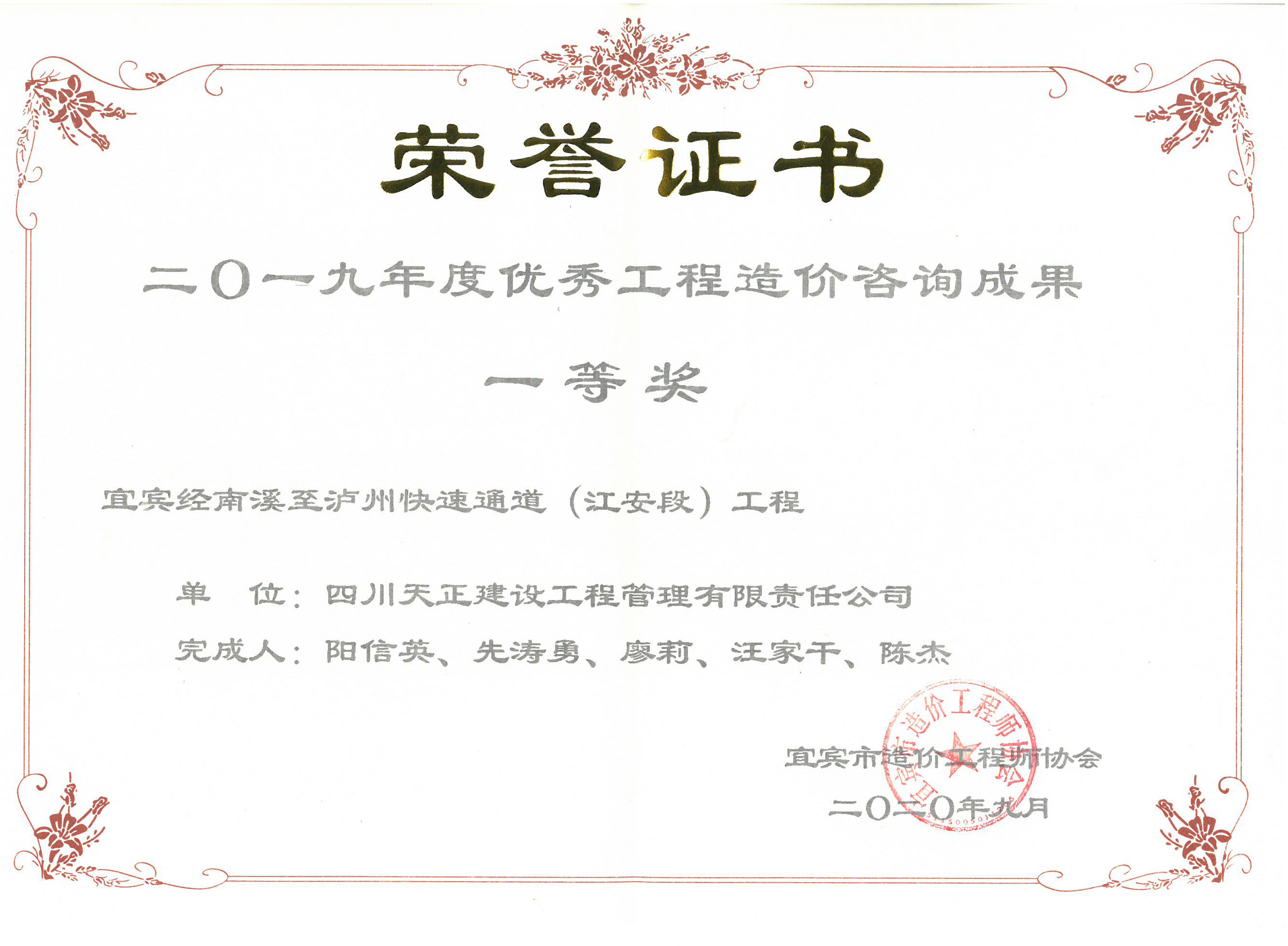 宜宾市2019年度优秀工程造价咨询成果一等奖
